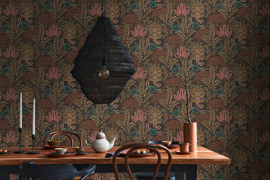 Add a touch of nature to your home with this Famous Garden wallpaper featuring a beautiful botanical print on a black background, on a textured vinyl for a truly enchanting wall covering.