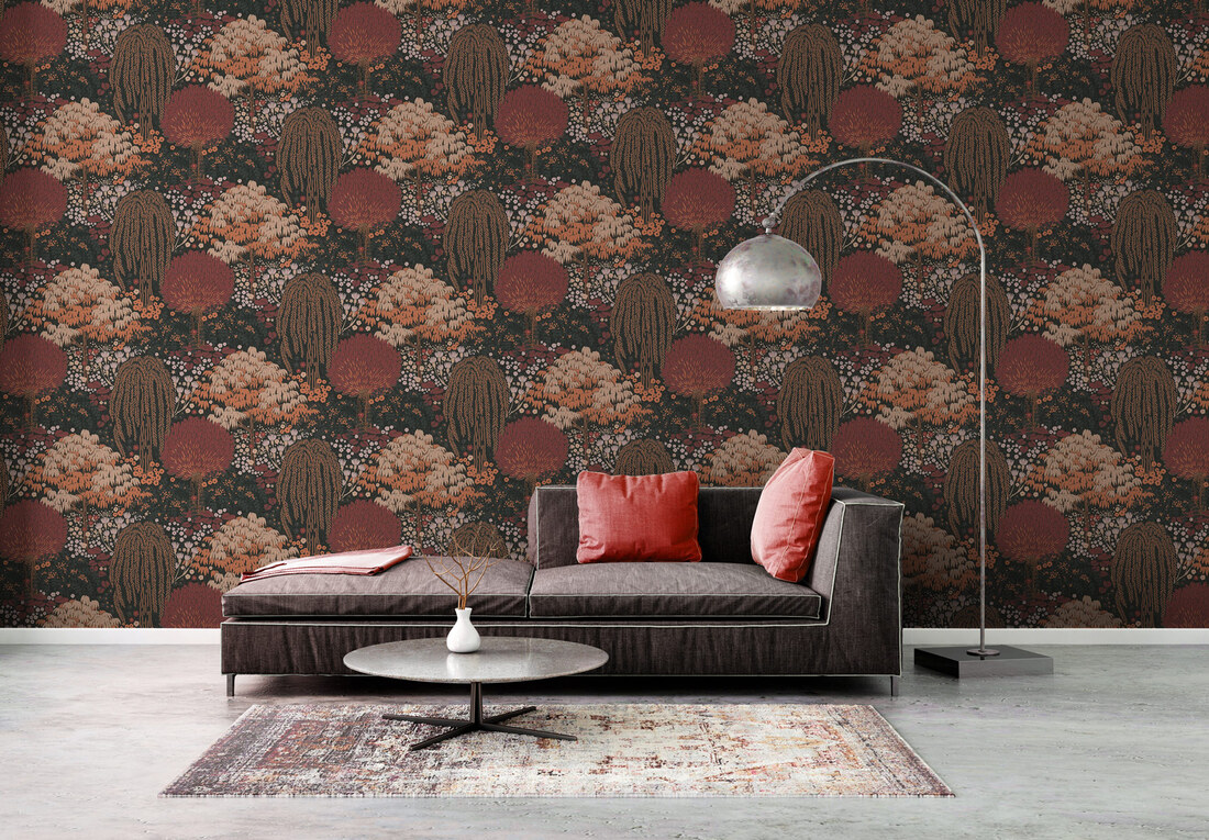 Add a touch of nature to your home with this Famous Garden wallpaper featuring a beautiful botanical print on a black background, on a textured vinyl for a truly enchanting wall covering.